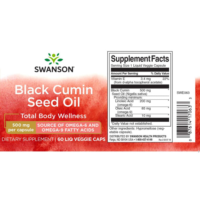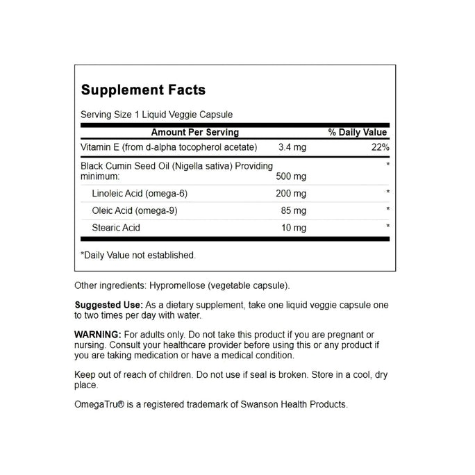 Swanson Black Cumin Seed Oil veggie capsules contain healthy amounts of the omega-6 linoleic acid and the omega-9 oleic acid along with all of the nutrients found in this amazing product. · Premium grade of pure Nigella Sativa · 60 Liquid capsules at a 500mg double strength dose per capsule · Contains both omega-6 linoleic acid and omega-9 oleic acids · Dietary Supplement Suggested Use As a dietary supplement, take one liquid veggie capsule one to two times per day with water. Hypromellose (vegetable capsule). Disclaimer We make no 'therapeutic claims'. Therapeutic is defined by the Australian Therapeutic Goods Administration (TGA) as: - Preventing, diagnosing, curing or alleviating a disease, ailment, defect or injury in persons or animals; or· Influencing, inhibiting or modifying a physiological process in persons or animals; - Testing the susceptibility of persons or animals to a disease or ailment; or Influencing, controlling or preventing conception in persons; or Testing for pregnancy in persons; or the replacement or modification of parts of the anatomy in persons or animals If there are healthcare concerns or questions, please contact your licensed healthcare professional for advice. Note: Please note that this is a natural health supplement and its not intended to diagnose or treat any disorder. No Therapeutic claims are made in this listing.DisclaimerWe " Shopycatch" make no 'therapeutic claims' with regard to any product. Therapeutic is defined by the Australian Therapeutic Goods Administration (TGA) as: