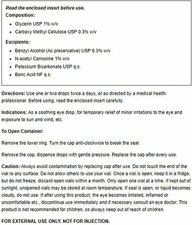 WHAT ARE CAN C EYE DROPS? Can C Eye Drops are one of the latest anti-ageing breakthroughs in eye treatment. Containing natural antioxidant N-acetylcarnosine, Can C Eye Drops protect the cells of your eyes from damage from free radicals and oxidative stress. These are the main cause of age-related eye disorders, meaning these drops can reduce, reverse and slow down the progression of cataracts, macular degeneration and other conditions. Can C Eye Drops also offer an effective solution to combatting tired eyes, eye strain or eye irritation from contact lens wear. Can C Eye Drops are also an effective, safe and suitable treatment for the reversal of cataracts in dogs. Please consult your veterinarian for advice on the use of Can-C Eye drops for your pets. Each pack of drops comes with 2 x 5ml bottles which provide 3 weeks of regular use. CAN-C EYE DROPS FEATURES · Lubricant eye drops help support lubrication · Designed to help with contact lens comfort and eye strain · Contains the unique antioxidant n-acetylcarnosine · Helps deliver carnosine directly to the aqueous humor · Designed to help soothe and relieve dry eyes N-ACETYLCARNOSINE FEATURES · May help and support the body to reduce free radicals in the lens · May help and support the body to help protect from oxidation and glycation · May help and support the body to reduce cross-linking of lens proteins · Natural antioxidant CAN-C EYE DROP INGREDIENTS