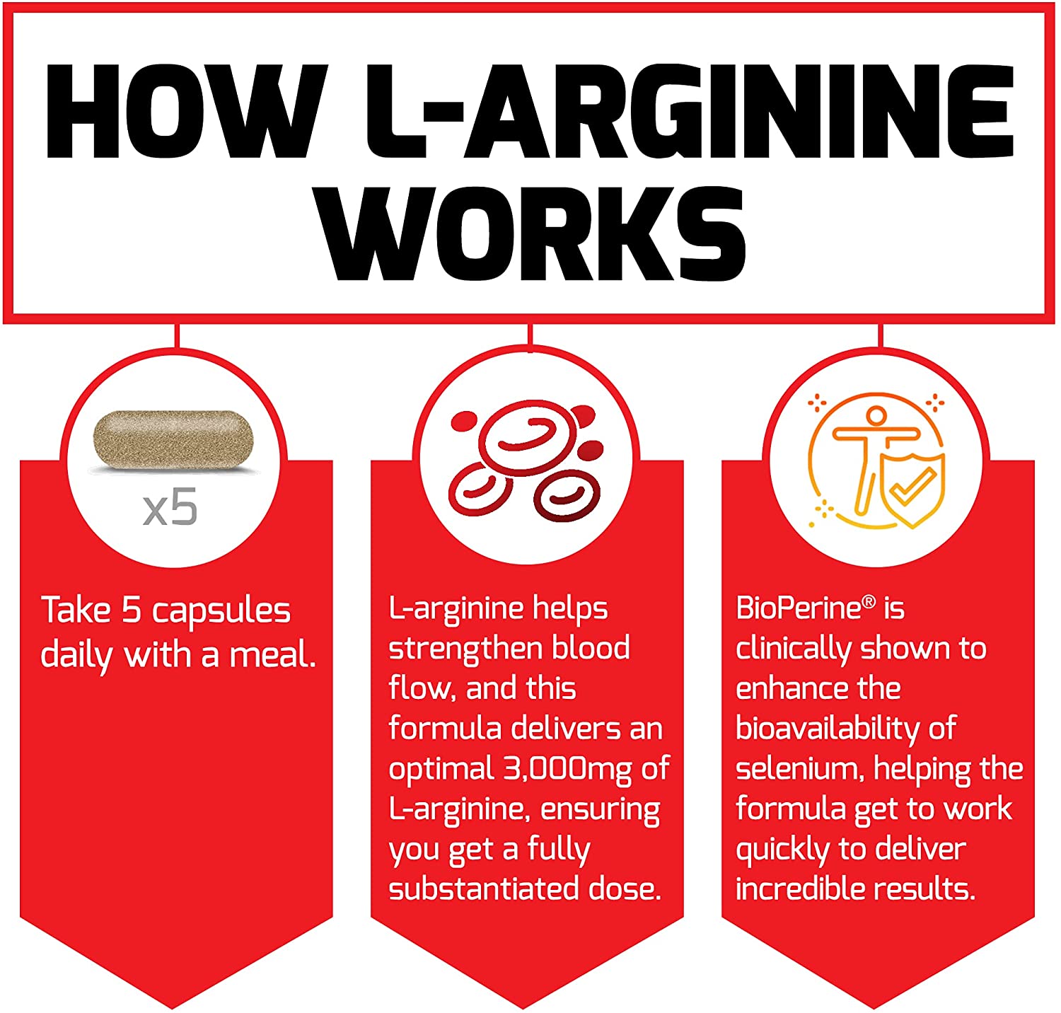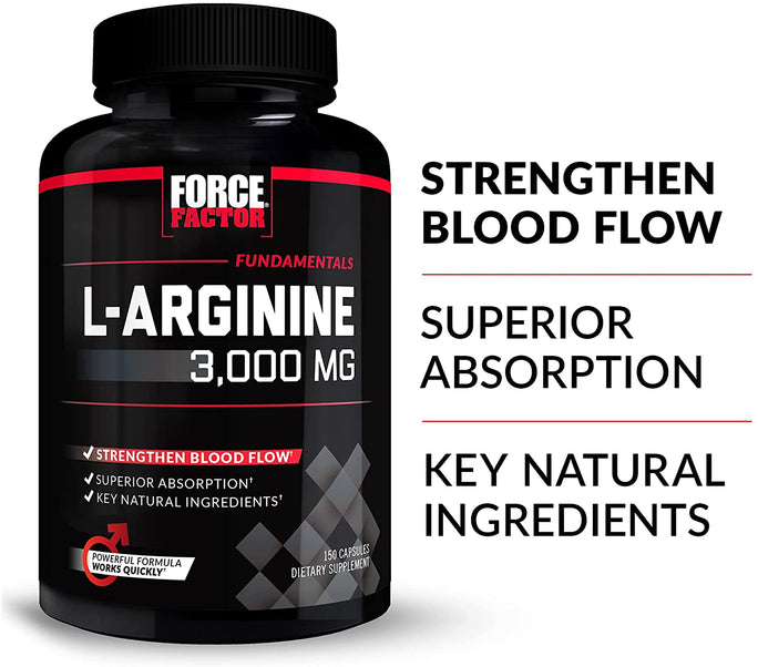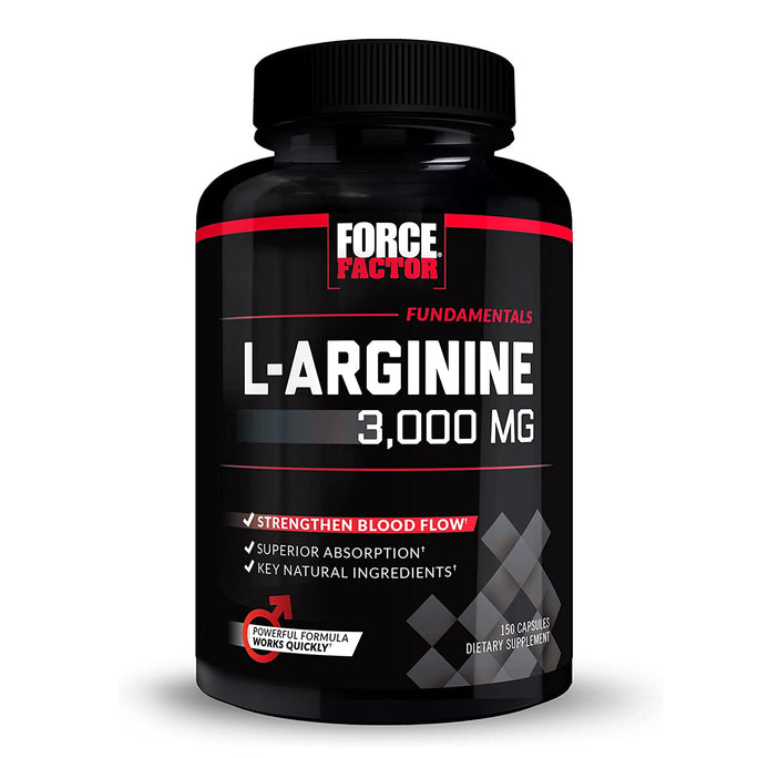 - L-arginine is a potent amino acid that occurs naturally in the body. It works to produce nitric oxide (N.O.), the "Miracle molecule" That helps relax blood vessels (known as vasodilation) and improve circulation, which leads to stronger blood flow. A fully substantiated 3, 000mg of L-Arginine in each serving, along with bioperine and selenium for optimal absorption, means there is no doubt that you are getting the dose scientifically shown to produce powerful results time after time. Every Fundamentals formula was purposefully designed to pair with the full line of premium Force Factor supplements, helping you tackle your goals and fully unleash your Potential.
